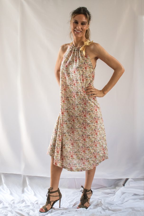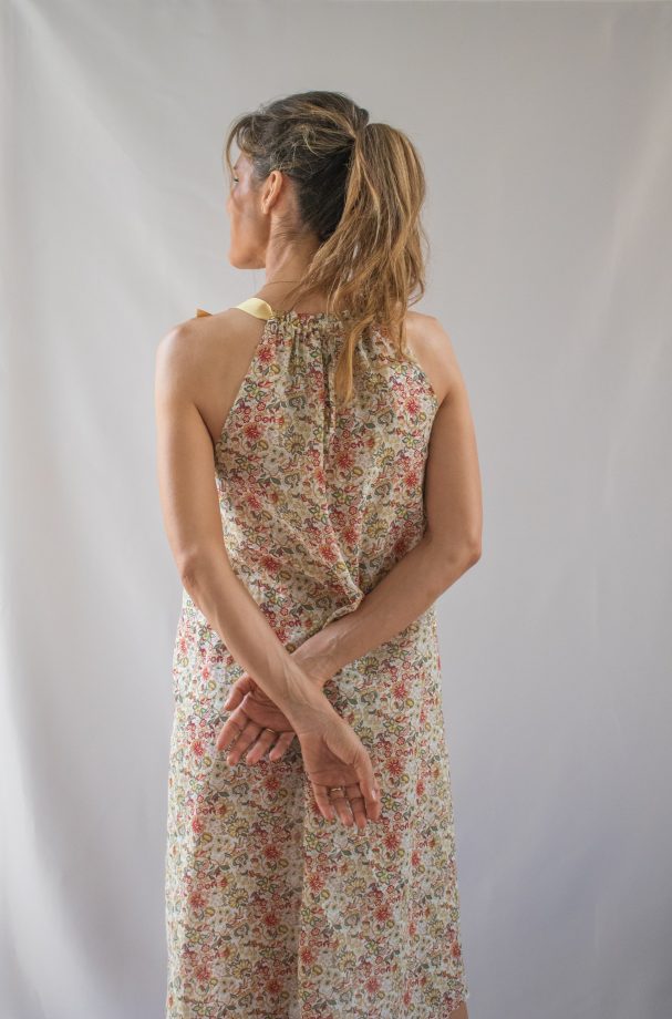 Nuestro clásico Venice Beach, de cuello halter vestido etéreo en  un tejido muy ligero en algodón 100%, ideal para la playa y días de mucho calor, con un estampado de flores sobre un fondo amarillo, fresco y juvenil para ir cómodamente por la playa Californiana. Tiene un largo midi con el bajo redondeado, cuidamos todos los detalles.